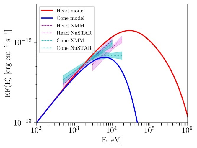 Рис. 1. Структура поля скоростей джетов микроквазара SS 433 определена цветовой шкалой (верхняя панель). Мощность истечения 2 x 1040 эрг/с. Модельные спектры рентгеновского синхротронного (внизу слева) и комптоновского гаама-излучения SS 433 (внизу справа) в сравнении с данными наблюдений. Источники наблюдательных данных указаны на врезках.