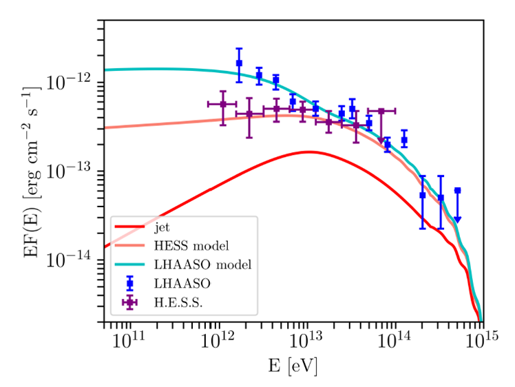 Выполнены релятивистские МГД расчеты распространения джетов SS433, и построена нелинейная кинетическая модель ускорения электронов и протонов в джетах до энергий свыше 1015 эВ с согласованным расчетом усиления и затухания турбулентных магнитных полей [1]. Синхротронное излучение со степенью поляризации выше 20% и комптоновское гамма-изучение ТэВ-ного диапазона произведено электронами с энергиями до 1 ПэВ. Спектры излучения джетов (Рис. 1) согласуются с данными наблюдений, а характеристики поляризации рентгеновского излучения соответствуют измеренным обсерваторией IXPE. Ускоритель конвертирует мощность порядка 1038 эрг/с в релятивистские протоны ПэВ - диапазона энергий, что может означать ключевую роль популяции подобных источников в формировании спектра галактических космических лучей в области излома.