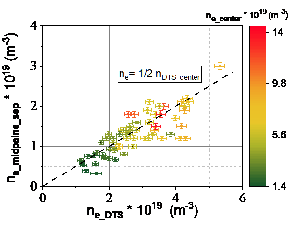 Рис.1. Концентрация в центре плазмы (выделено цветом) и на сепаратрисе (вертикальная ось) в средней плоскости, как функция максимального ne, измеренного с помощью DTS