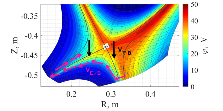 Рис.2. Электростатический потенциал и дрейфовые потоки в области дивертора